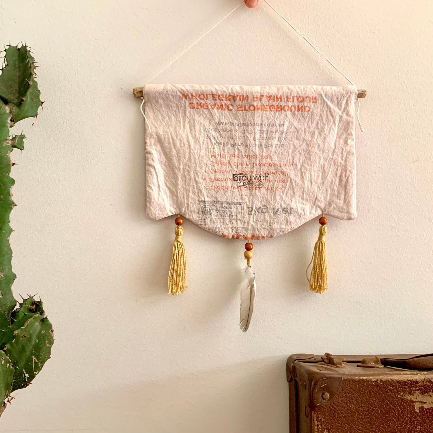 Soleil mini wall hanging. Made with organic canvas and backed with a repurposed flour sack. Adorned with handmade tassels, beads and feathers found on the land. Hangs with a piece of salvaged bamboo Lovingly made in our solar powered caravan